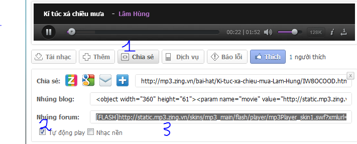 | A .cach up nhac tu mp3 vao blog DAU TIEN CHON BAI HAT 1. chia se 2. chon tu dog play 3. copy phan nhung forum: [FLASH]http://static.mp3.zing.vn/skins/mp3_main/flash/player/mp3Player_skin1.swf?xmlurl=http://mp3.zing.vn/blog?MjAxMS8xMC8yMy9hLzAvInagaMEYTA1MThkMzk1MmEyMmExYTI0MTMxOWYzYzg1YThlODkdUngWeBXAzfEvInagaMEDrSB0w7pjIHjDoSBjaGnhdUng4F1IG3GsGEgIHxMw6JcU IbaBIEjDdUngW5nfDF8Mw[/FLASH]